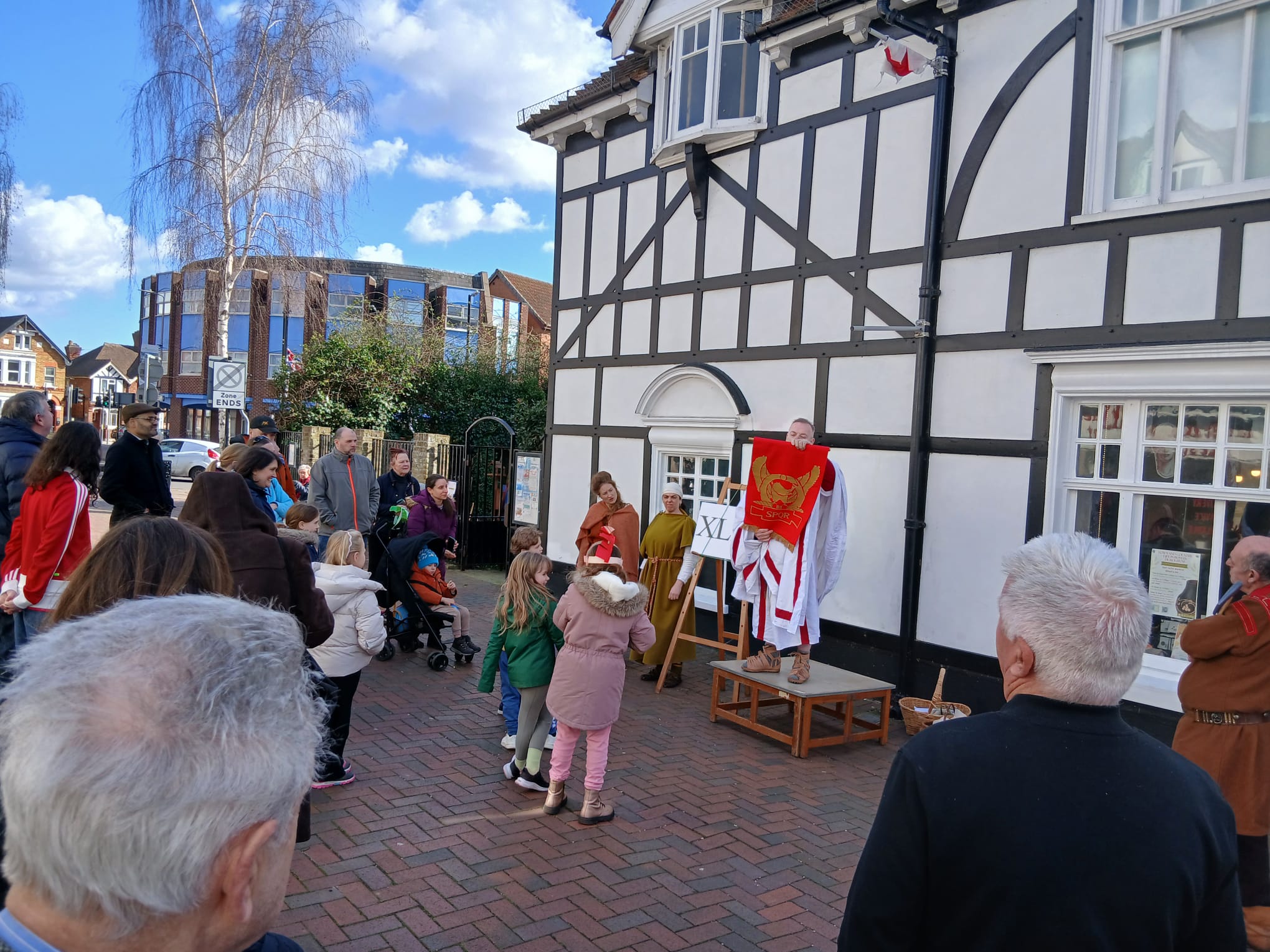 Kathy, Simon and TWT regular S-J performing a 40 minute promenade play about the Roman history of Durolitum – the area around Epping, for the Epping Forest District Museum to publicise their new Roman exhibition. The weather gods favoured us and we traversed the High Street from Museum to Market to Abbey and back to the Museum again, taking our audience on a journey through time from the arrival of the Romans, the settlement of Britannia, the changes that happened under Roman rule and then the end! Lots of interaction, crowd wrangling, gossiping and voting! It was a reminder to us of where we started – three performers telling a story drawn from real historical events but with our special TWT touch to make it accessible and fun for all!